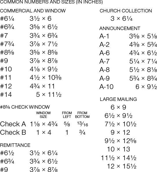 Below are sizes of all standard commercial, announcement and large mailng envelopes for your easy reference.